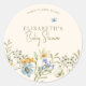 Delicate wildflowers meadow bouquet with pastel watercolor floral blooms elegant chic spring or summer garden gender neutral baby in bloom shower personalised sticker with whimsical elegant modern calligraphy script over a cream ivory background.