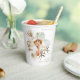 This whimsical neutral botanical graduation party paper cup features a modern boho wreath with two circular photos, the graduate's name, class year, and school name.
