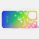 Colourful gradient blend of bright blue, green, yellow, orange and pink with falling bokeh sparkles in white. Personalise with your name or initials in white sans font lettering.