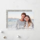 Elegant holiday photo card features a full bleed landscape-orientated photo with a bokeh light flare overlay for a festive and bubbly look. "Happy New Year" or your choice of holiday greeting is overlaid in black script lettering, with your name(s) and the year alongside. Add two additional photos to the back, along with a custom message, on a neutral botanical patterned background.