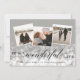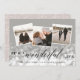 Elegant holiday photo card features three square photos in a collage layout, with a bokeh light flare overlay for a festive and bubbly look. "It's a wonderful life" is overlaid in black script and block lettering, with your name(s) and the year beneath. Cards reverse to a neutral botanical patterned background.
