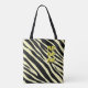 with a bold animal print in zebra style this bag is perfect both for work and for play. One side says Work and one side says Play. Contrasting colours in text and background makes it stand out. And font with a dark shadow makes the words pop. For all who can resist a animal print.