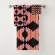 A bath towel set in a bold pink, coral, and a rusty orange modern pattern and the black background colour can be switched to any colour to coordinate with your home decor.