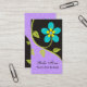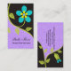 Bold big turquoise stylised flower business cards template. An elegant, impressive design, with a bold turquoise flower with green leaves on black and purple background. On the purple there is a damask pattern. Click on Customise it and choose from over 200 colours to change the background colour (purple). Great for a florist, textiles or for a personal profile card.