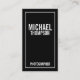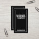 Bold Black and White Business Card featuring information in white bold sans serif font style with white border on black background.