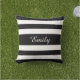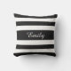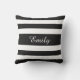 Bold Black And White Stripes Pattern Your Name Outdoor Pillow. A stylish and unique minimalist bold black and white striped outdoor patio pillow with a personalised white name print in the centre.