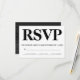 Bold black and white typography wedding RSVP response card. The back includes a white striped pattern on black.