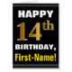 This simple birthday-themed greeting card design features a warm birthday wish like "HAPPY 14th BIRTHDAY, First-Name!" on the front, in bold text on a black coloured background. The birthday number has a faux/imitation gold-like colouring appearance. The name on the front can be customised. The inside features a customisable birthday message. A greeting card like this could be a fun way to deliver birthday wishes to somebody who is celebrating their fourteenth birthday. [~Z0000275]