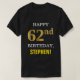 This simple birthday-themed, black-coloured shirt design features a warm birthday wish like "HAPPY 62nd BIRTHDAY, STEPHEN!" on the front, in bold text. The birthday number has a faux/imitation gold-like colouring appearance. The name on the front can be customised. A shirt like this could be a fun way to deliver birthday wishes to somebody who is celebrating their sixty second birthday. [~Z0000318]