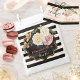 These chic and modern bridal shower napkins match the bridal shower invitation collection shown below and feature a black and ivory striped background pattern with a decorative black overlay trimmed in gold edging with bouquets of flowers on the upper left side and lower right side. The floral bouquets include several roses in pink, cream, and pale yellow with orange Peruvian lilies and green foliage mixed in. The customisable words, "Melissa's Bridal Shower" are printed in coral pink and sage green at the top of the napkins with ivory and gold lettering that says, "Thank you for being here!" with the date below. These would look fabulous beside your bridal or wedding shower cake, treats, or beverages.