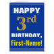 This simple birthday-themed greeting card design features a warm birthday wish like "HAPPY 3rd BIRTHDAY, First-Name!" on the front, in bold text on a blue coloured background. The birthday number has a faux/imitation gold-like colouring appearance. The name on the front can be customised. The inside features a birthday message that can be personalised. A greeting card like this could be a fun way to deliver birthday wishes to somebody who is celebrating their third birthday. [~Z0000278]