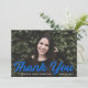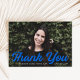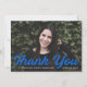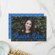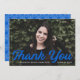Simple and stylish graduation thank you card featuring the graduate's horizontal photo with "Thank You" in a bold blue script. Personalise the front of the photo graduation thank you card by adding the graduate's name, school name, and graduation year. The card reverses to display your typed or handwritten message with a blue and white geometric arch pattern background.
