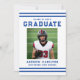 Celebrate your graduate’s achievement with this bold varsity-style blue graduation party invitation, featuring classic athletic stripes and strong collegiate typography for a timeless sports-inspired look. The front showcases the graduate’s photo alongside their name, school, and graduation year in a clean, structured layout that highlights their accomplishment with confidence and pride. The back features a horizontal photo at the top, with space below for graduation party details including the date, time, location, and RSVP information, creating a complete and personalized design. Perfect for high school and college seniors, student athletes, and sports enthusiasts, this blue photo graduation party invitation offers a polished and memorable way to invite guests to celebrate their milestone.