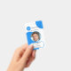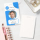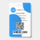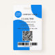 Photo ID badge featuring your custom photo and logo on a colourful blue white retro design. The lower text area on the front shows a rectangular shape, which you can scale in the advanced editor. On the back you can add a custom bar code or QR code and additional texts (or delete the templates). Great to create an eye-catching presence.