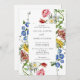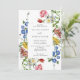 A colourful modern floral wedding invitation featuring a rectangular frame overlaying large watercolor flowers in blue, yellow, white, red and pink on a white background.
