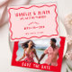 The striking combination of bright pink and red hues adds a burst of energy and excitement to your save the date. These colours symbolise love, passion, and celebration, setting the perfect tone for your upcoming wedding. The bold typography adds a contemporary touch, ensuring that your important date stands out in style.