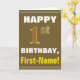 This simple birthday-themed greeting card design features a warm birthday wish like "HAPPY 1st BIRTHDAY, First-Name!" on the front, in bold text on a brown coloured background. The birthday number has a faux/imitation gold-like colouring appearance. The name on the front can be customised. The inside features a birthday message that can be customised. A greeting card like this could be a fun way to deliver birthday wishes to somebody who is celebrating their first birthday. [~Z0000281]
