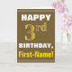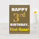 This simple birthday-themed greeting card design features a warm birthday wish like "HAPPY 3rd BIRTHDAY, First-Name!" on the front, in bold text on a brown coloured background. The birthday number has a faux/imitation gold-like colouring appearance. The name on the front can be personalised. The inside features a birthday message that can be personalised. A greeting card like this could be a fun way to deliver birthday wishes to somebody who is celebrating their third birthday. [~Z0000281]