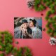 Modern foil save the date postcards featuring your horizontal engagement photo with "Save the Date" in a gold foil brush script. Personalise the front of the photo save the date postcard by adding your names, wedding date, and city/state. The back of the postcard features your return address, names, and wedding details such as your wedding date, wedding website, etc.