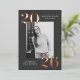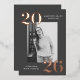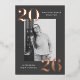 Modern graduation party invitations featuring the graduate's vertical photo framed in charcoal grey with 2025 in bold, rose gold foil lettering at the top left and bottom right corners. Personalise the front of the photo graduation party invites with the graduate's name and school name. The foil graduation invitation reverses to display your party details in white lettering with a charcoal grey background. The background colour can be changed to a colour of your choice with our edit design feature. The charcoal grey graduation party invites work perfectly for both high school and college graduation parties.