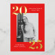Modern graduation party invitations featuring the graduate's vertical photo framed in red with 2025 in bold, gold foil lettering at the top left and bottom right corners. Personalise the front of the photo graduation party invites with the graduate's name and school name. The foil graduation invitation reverses to display your party details in white lettering with a red background. The background colour can be changed to a colour of your choice with our edit design feature. The red graduation party invites work perfectly for both high school and college graduation parties.