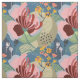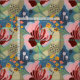 A bold exotic abstract floral pattern in bright shades of blue, green, gold, and burgundy.
