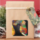 A sticker with an elephant head in bold vibrant colours of yellow, green, orange and more giving it a random abstract look to it. Set on a black background.