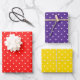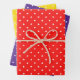 Bold and bright wrapping paper sheets, all three with petite white hearts pattern on bold primary colour backgrounds.