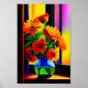 Beautiful artistic print features tabletop bold orange floral bouquet in a blue glass vase basking in the sunlight. A "Fine Art" style digital painting created with AI software.