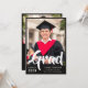 A graduation announcement and graduation party invitation in one! Show off your graduate's achievement with this bold typography graduation announcement with their photo in the spotlight, with Grad written in a bold white script in a modern style across the bottom of the photo. Personalize the custom text with the year, your graduate's name, the school they graduated from, and the degree they've gotten. Add the graduation celebration invite on the back of the card, beneath a second photo of the graduate. He did it! is written across the second photo, but as the text is editable, you can change it to She did it or They did it, depending on the pronoun of the graduate. The text is a stark white against a black background.