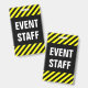 This badge design features a black and yellow striped pattern, along with the message "EVENT STAFF" in bold text. It could perhaps be used to identify people as working for the organizers of an event.