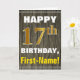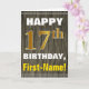 This simple birthday-themed greeting card design features a warm birthday wish like "HAPPY 17th BIRTHDAY, First-Name!" on the front, in bold text on a faux wood appearance pattern background. The birthday number has a faux/imitation gold-like colouring appearance. The name on the front can be personalised. The inside features a customisable birthday message. A greeting card like this could be a fun way to deliver birthday wishes to somebody who is celebrating their seventeenth birthday. [~Z0000280]