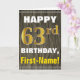 This simple birthday-themed greeting card design features a warm birthday wish like "HAPPY 63rd BIRTHDAY, First-Name!" on the front, in bold text on a faux wood appearance pattern background. The birthday number has a faux/imitation gold-like colouring look. The name on the front can be personalised. The inside features a birthday message that can be personalised. A greeting card like this could be a fun way to deliver birthday wishes to somebody who is celebrating their sixty third birthday. [~Z0000280]