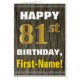 This simple birthday-themed greeting card design features a warm birthday wish like "HAPPY 81st BIRTHDAY, First-Name!" on the front, in bold text on a faux wood appearance pattern background. The birthday number has a faux/imitation gold-like colouring appearance. The name on the front can be personalised. The inside features a birthday message that can be personalised. A greeting card like this could be a fun way to deliver birthday wishes to somebody who is celebrating their eighty first birthday. [~Z0000280]