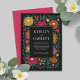 This gorgeous wedding invitation features a hand drawn floral design in magenta pink, orange, golden yellow, and emerald green over a black background. The style is almost chalk - like / pastels. The background colours on both the front and the back can be customised, if desired. Simple, elegant, bold, and modern - perfect for your special day!