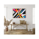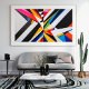 A striking geometric abstract design featuring bold, angular shapes in vivid colors. The dynamic combination of black, white, red, yellow, and blue creates a modern and energetic visual statement, perfect for decor, accessories, and fashion.