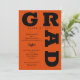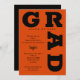 GRAD in bold black lettering curves around the edges of these orange background graduation party invitations. SEE ENTIRE COLLECTION of pre-done colour combinations, paper plates, napkins, favour boxes and graduation party invitations in our store.