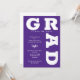 GRAD in bold white lettering curves around the edges of these purple background graduation party invitations. SEE ENTIRE COLLECTION of pre-done colour combinations, paper plates, napkins, favour boxes and graduation party invitations in our store.