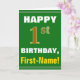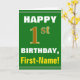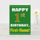 This simple birthday-themed greeting card design features a warm birthday wish like "HAPPY 1st BIRTHDAY, First-Name!" on the front, in bold text on a green coloured background. The birthday number has a faux/imitation gold-like colouring appearance. The name on the front can be personalised. The inside features a customisable birthday message. A greeting card like this could be a fun way to deliver birthday wishes to somebody who is celebrating their first birthday. [~Z0000279]