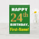 This simple birthday-themed greeting card design features a warm birthday wish like "HAPPY 24th BIRTHDAY, First-Name!" on the front, in bold text on a green coloured background. The birthday number has a faux/imitation gold-like colouring appearance. The name on the front can be personalised. The inside features a birthday message that can be customised. A greeting card like this could be a fun way to send birthday wishes to somebody who is celebrating their twenty fourth birthday. [~Z0000279]