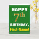 This simple birthday-themed greeting card design features a warm birthday wish like "HAPPY 7th BIRTHDAY, First-Name!" on the front, in bold text on a green coloured background. The birthday number has a faux/imitation gold-like colouring appearance. The name on the front can be personalised. The inside features a birthday message that can be customised. A greeting card like this could be a fun way to deliver birthday wishes to somebody who is celebrating their seventh birthday. [~Z0000279]