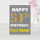 This simple birthday-themed greeting card design features a warm birthday wish like "HAPPY 50th BIRTHDAY, First-Name!" on the front, in bold text on a grey (grey) coloured background. The birthday number has a faux/imitation gold-like colouring appearance. The name on the front can be personalised. The inside features a birthday message that can be personalised. A greeting card like this could be a fun way to deliver birthday wishes to somebody who is celebrating their fiftieth birthday. [~Z0000283]