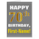 This simple birthday-themed greeting card design features a warm birthday wish like "HAPPY 70th BIRTHDAY, First-Name!" on the front, in bold text on a grey (grey) coloured background. The birthday number has a faux/imitation gold-like colouring look. The name on the front can be customised. The inside features a birthday message that can be personalised. A greeting card like this could be a fun way to deliver birthday wishes to somebody who is celebrating their seventieth birthday. [~Z0000283]