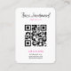 A stylish and vibrant layout designed for hair stylists, featuring a modern social profile theme, bold pink icons, and a scannable QR code for easy online access. Includes photo slots and all essential contact details.
