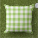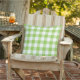 A bold lime green and white gingham plaid outdoor pillow with a vibrant small-scale check pattern. The lively green gingham brings energetic, garden-party style to patio seating, deck chairs, or poolside lounging. A fun pattern that pairs well with floral and solid outdoor accents.