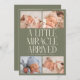 Modern Christmas theme birth announcement card featuring a bold typography text that says "a little miracle arrived" with 4 of your newborn pictures. This is a birth announcement card for the holiday seasons! Add your pictures, birth stats, and a message! The background is sage green.