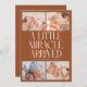 Modern Christmas theme birth announcement card featuring a bold typography text that says "a little miracle arrived" with 4 of your newborn pictures. This is a birth announcement card for the holiday seasons! Add your pictures, birth stats, and a message! The background is terracotta.