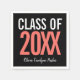 Modern and Bold graduation party paper napkins in white and living coral over a black background.