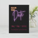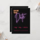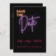 A bold, modern neon sign Save The Date Card in bright orange and purple on a black background. The back of the card features a neon-coloured heart and a bright red Invitation to follow sign. Announce your upcoming nuptials to your family and friends in bold, neon colours. They'll definitely not miss this! If you'd like to change the colours of the neon signs, please contact the designer. Note: the neon effect comes out best on glossy or semi-gloss paper.