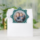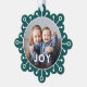 Send unique holiday greetings with these fun photo Christmas cards that double as ornaments or large gift tags! They feature a simple snowflake design, modern typography reading JOY, and a circle shaped photo template over a dark teal background. A dark gradient over the bottom of your photo allows the text to stand out. It can be adjusted, if needed. The back of the ornament card contains text templates for a message and personalisation.